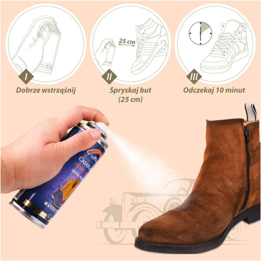 The Casablanca Water Stop Spray for Nubuck and Velour 160ml provides an invisible, waterproof barrier that protects your footwear and accessories from water, snow, salt, grease stains, and other contaminants. With its long-lasting effect, this spray is especially ideal for winter, ensuring your shoes, coats, gloves, and other items stay protected in harsh weather conditions. The easy one-step application is quick and efficient, and it is suitable for all colors without altering the appearance of the surface. Casablanca Water Stop Spray reduces the absorption of moisture and stains, keeping your items looking fresh and well-maintained.